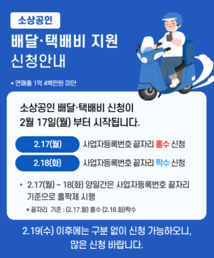 사이트: "소상공인 배달택배비지원.kr" 및 "소상공인24"에서 신청 가능