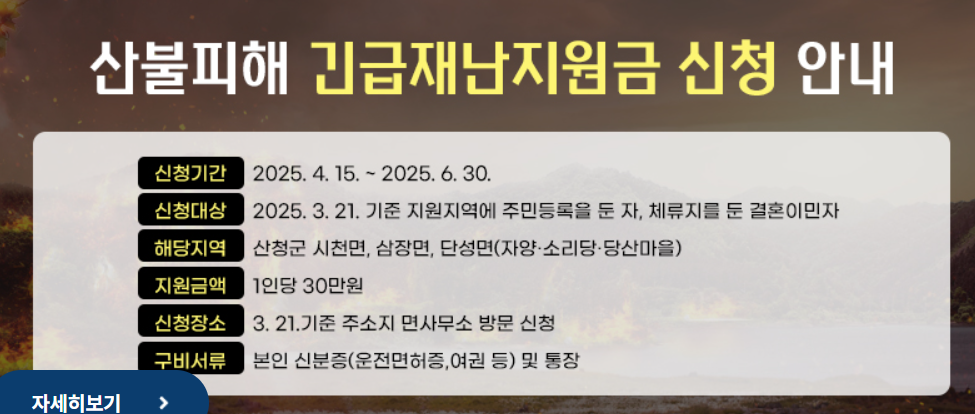 산청군은 산불 피해 주민들의 생계안정과 일상 복귀를 지원하기 위해 긴급재난지원금과 생활안정지원금 지급을 결정했습니다.