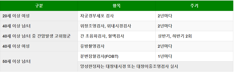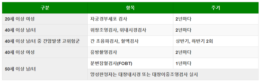 암 건강검진은 위암, 대장암, 간암, 유방암, 자궁경부암을 주요 검진 항목으로 포함하고 있으며, 각 검진의 주기도 상세히 명시되어 있습니다.