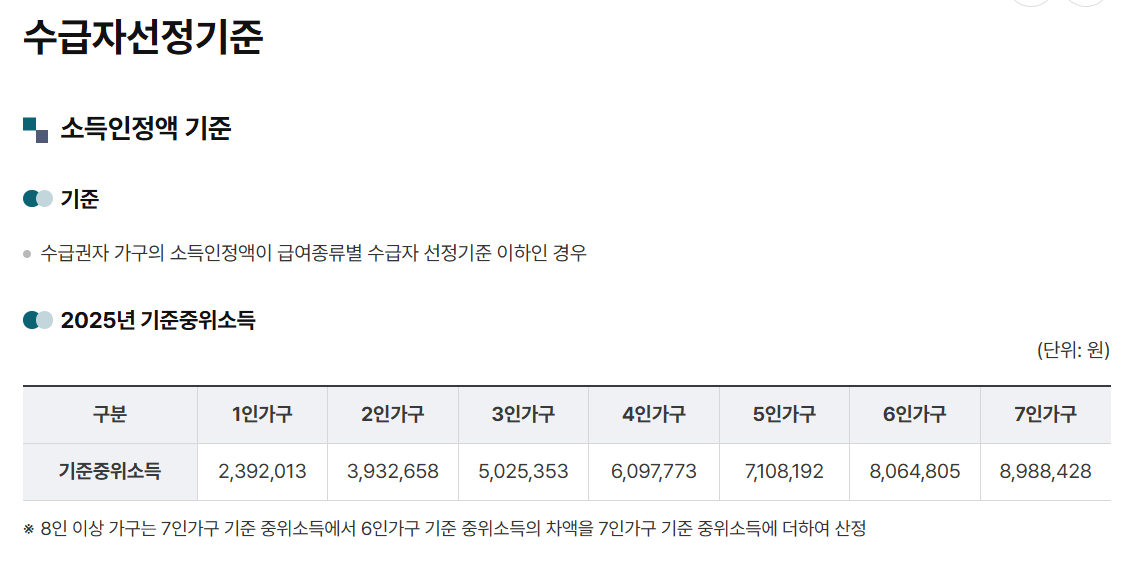 소득인정액은 가구의 실제 소득과 재산을 소득으로 환산한 금액을 합산하여 계산합니다. 이 금액이 중위소득 대비 일정 기준 이하일 경우 급여 수급 자격이 주어집니다. 2025년 기준 중위소득은 가구원 수에 따라 달라지며, 예를 들어 1인 가구의 경우 약 2,200,000원, 2인 가구의 경우 약 3,700,000원 등으로 책정됩니다.
