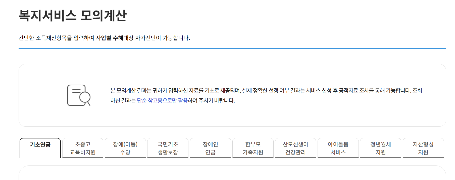 본인이 기초연금 수급 가능 대상자인지 여부, 예상되는 월 지급 금액, 소득인정액 산정 방식 등을 종합적으로 확인할 수 있습니다. 특히 소득이나 재산 정보를 대략적으로 입력만 해도 바로 결과를 알 수 있어 매우 편리합니다.