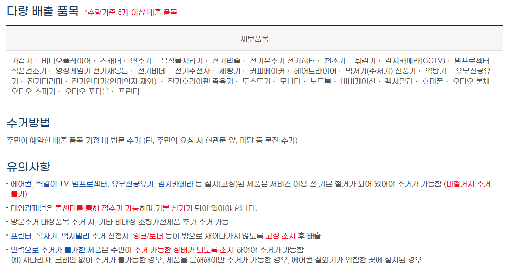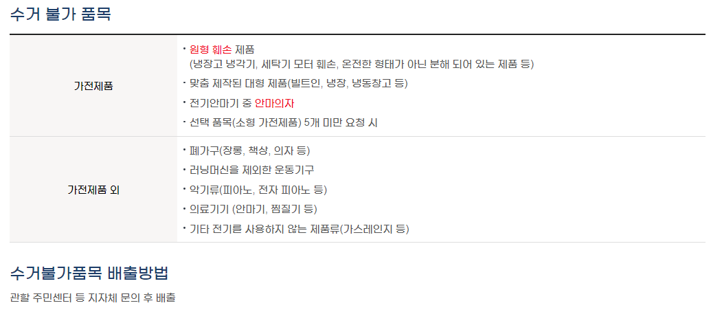 원형 훼손 제품 냉장고 냉각기, 세탁기 모터 훼손, 온전한 형태가 아닌 분해 되어 있는 제품 등 맞춤 제작된 대형 제품 빌트인, 냉장, 냉동창고 등 전기안마기 중 안마의자 선택 품목 (소형 가전제품) 5개 미만 요청 시 가전제품 외 폐가구(장롱, 책상, 의자 등), 러닝머신을 제외