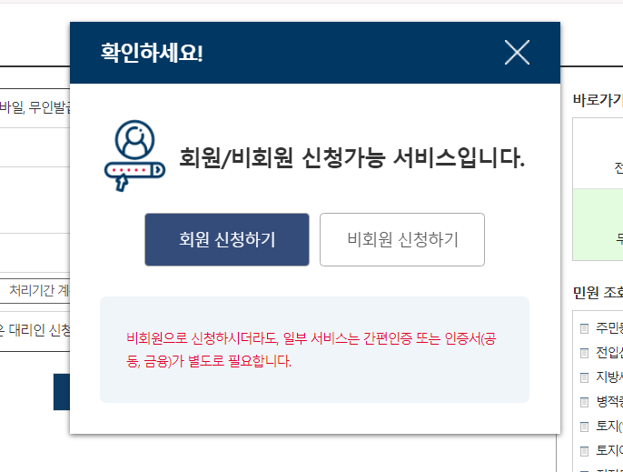 회원신청 또는 비회원신청 모두 가능합니다. 두 가지 모두 본인인증(공인인증서 또는 스마트폰 간편인증)이 필요합니다.