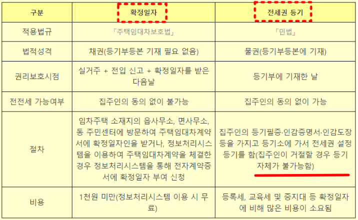 특별한 사유가 아니라면 절차도 단순하고 수수료도 저렴한 '확정일자'만 하셔도 됩니다. 다만 이와 같은 차이는 있습니다.(참고)