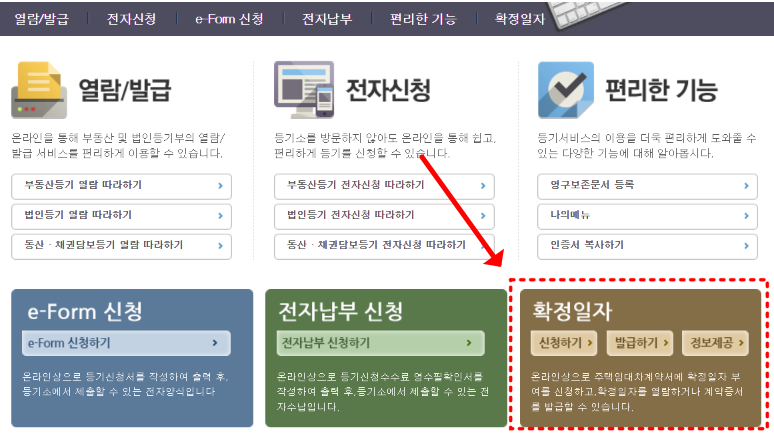 대한민국 인터넷 등기소에 접속하여 메뉴 중 '확정일자' 에서 '신청하기'를 누르면 됩니다.
