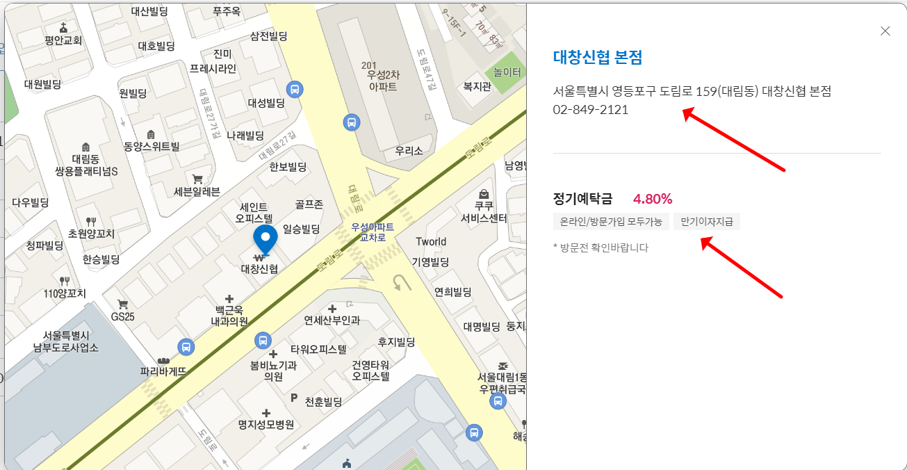 이렇게 검색을 해 보면 되며, 위와 같이 지점의 전화번호가 나오기 때문에 방문 전 꼭 전화를 해 보시기 바랍니다. 지점의 사정에 따라 금리가 변동되거나 판매가 마감되었을 수 있기 때문입니다.