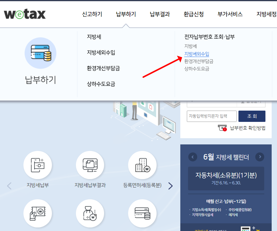 위택스 홈페이지 접속 후 상단 메뉴 중 '납부하기' 에서 '지방세외수입'을 눌러줍니다.