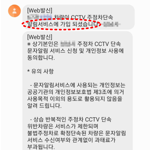 각 지자체에서도 불법 주차로 인한 민원, 이를 단속하는 인력투입 등에 대한 비용이 절감된다고 하니 운전자와 지자체 모두에게 좋은 서비스입니다. 주정차 금지 지역에 주차를 하면 CCTV 단속에 적발되게 됩니다. 이 때 과태료가 부과되기 전에 경고 안내 메세지를 받을 수 있는 서비스입니다.