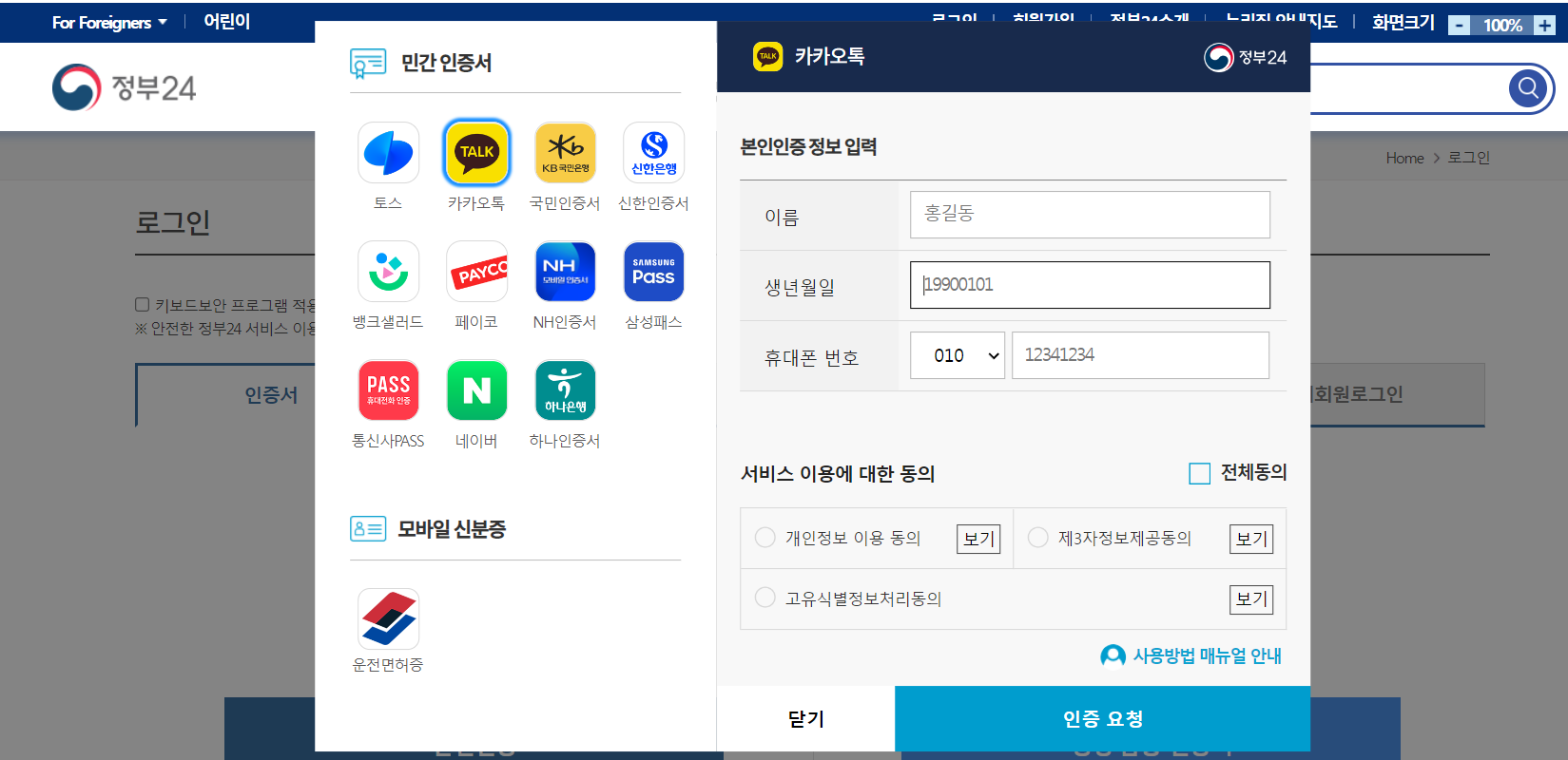 - 공동인증서는 물론, 토스, 카카오뱅크, 네이버 등 각종 금융사 및 통신사 간편인증도 가능합니다.