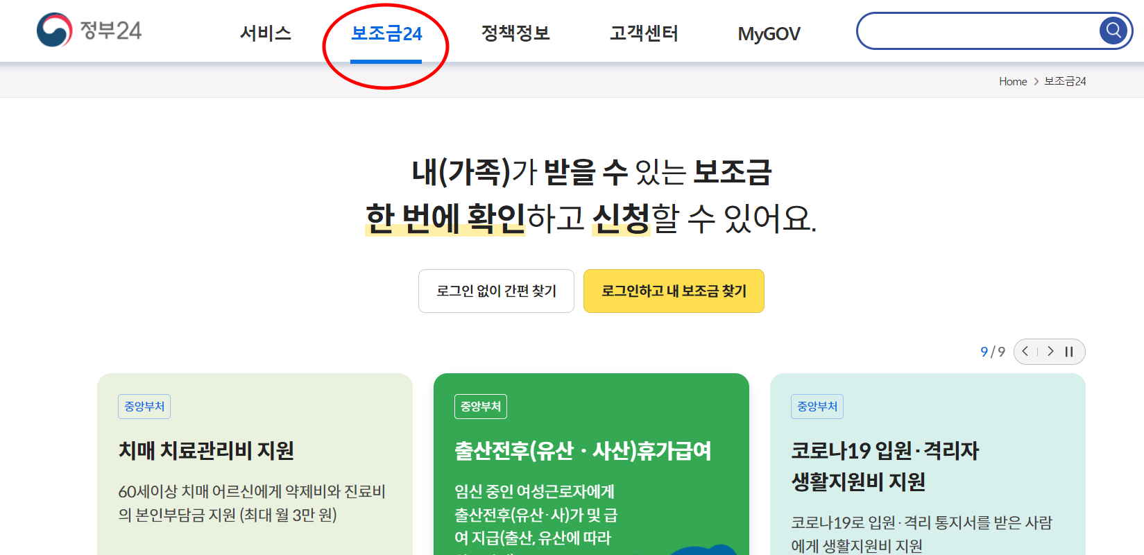 1. 정부24 홈페이지 (또는 어플리케이션) www.gov.kr 로 접속하여 '보조금24'를 클릭하세요.