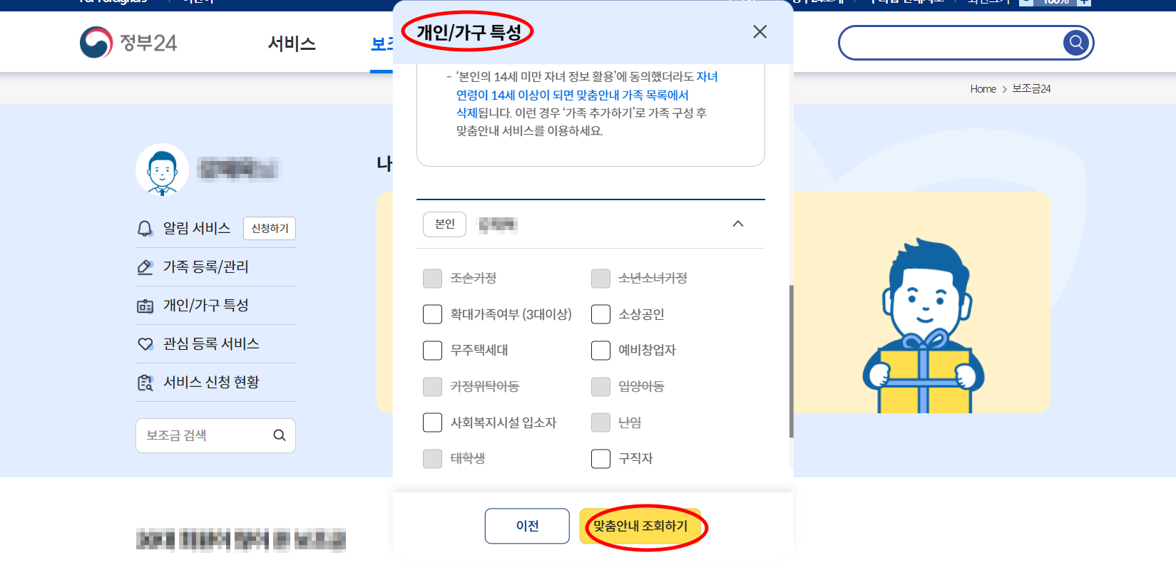 - 개인/가구 특성을 체크하는 칸이 나옵니다. 간단히 체크해주고 맞춤안내 조회하기를 누릅니다.