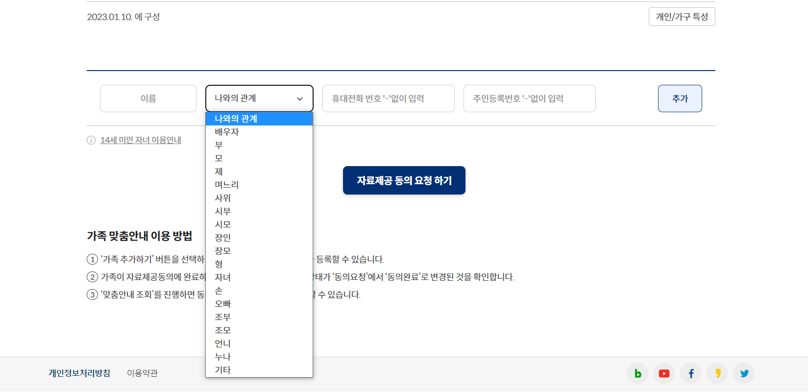 - 동일세대 14세 미만가족은 따로 추가가 안되니 참고하세요. 동일세대기 때문에 추가하지 않아도 조회가 됩니다. (저는 추가했다가 다시 삭제했습니다.)