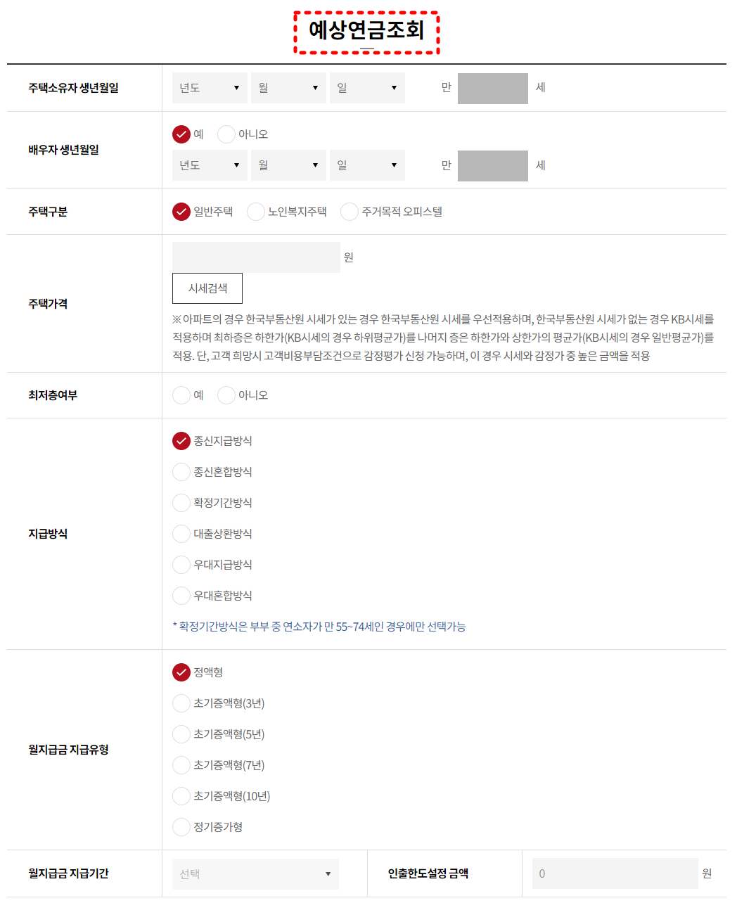주택공사 사이트를 통하면 예상연금액 조회가 가능한데요, 해당되는 정보를 넣고 지급방식 선택 후 온라인으로 ✅간편하게 연금액을 조회해 보세요.