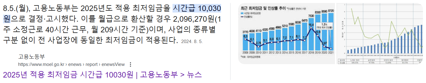 고용노동부는 2025년도 적용 최저임금을 시간당 10,030원으로 결정‧고시했습니다. 이는 2024년 최저임금인 9,860원에서 1.7% 인상된 금액으로, 월 환산액은 2,096,270원(주 40시간 근무, 월 209시간 기준)입니다.